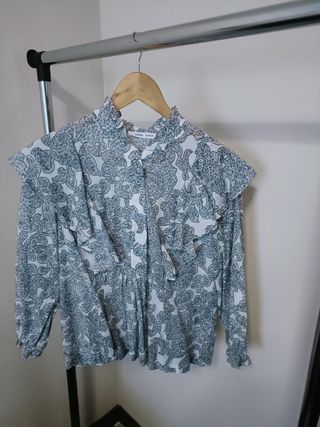 Blusa de manga larga con un bonito estampado de pajaritos y detalles de volantes. T. Xs Hago envío. - Cuello alto con plisado. - Volantes en los hombros y en el pecho. - Encaje en la zona del escote. - Estampado de pájaros y plumas.