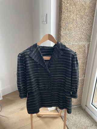 Elegante blusa negra con un diseño de rayas finas y brillantes. - Cuello camisero. - Cierre de botones. - Mangas largas abullonadas con puño. - Detalle de fruncido en la cintura.