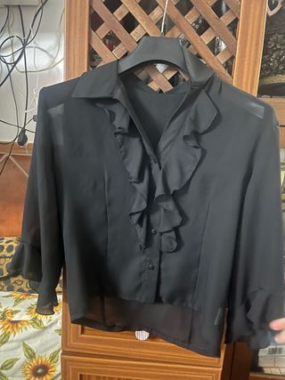 Elegante blusa negra con detalles de volantes. - Diseño con cuello camisero. - Mangas acampanadas con volantes. - Cierre de botones. - Tejido ligero y vaporoso.