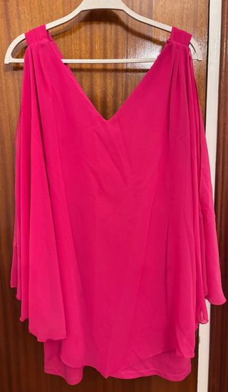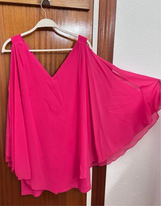 Elegante blusa con tirantes y detalles de velos en color fucsia. Su diseño la hace ideal para diversas ocasiones. PRECIO NEGOCIABLE - Diseño con tirantes. - Mangas con velos. - Acabado en color fucsia.