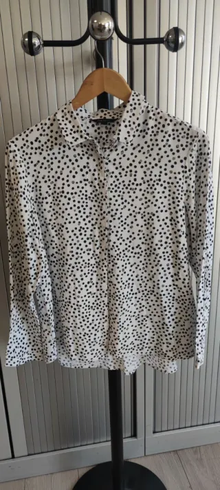 Blusa de manga larga con un estampado de lunares irregulares en color negro y gris. - Diseño con cuello camisero. - Cierre de botones. - Bajo con corte.