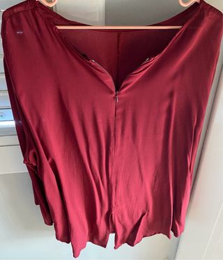 Blusa en color granate. El tejido es ligero y fluido, con un corte moderno. - Cuello redondo. - Manga 3/4 - Abertura bajo y en espada. Cierre cremallera en espalda - Detalle de costura central en la espalda. - Bajo asimétrico. Medidas: ancho 62 y largo 68