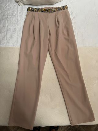 Elegantes pantalones de vestir en color beige. La cintura está adornada con una banda de pedrería en tonos dorados y plateados. - Cintura con pedrería. - Diseño de pierna recta. - Pinzas delanteras. Incluye pantalón, blusa y jersey calado. Si te interesa alguna parte por separado, no dudes en escribirme.
