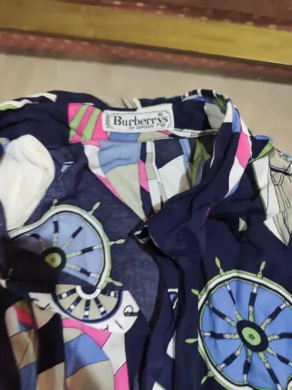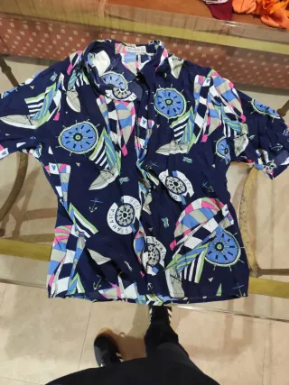 Preciosa blusa con un llamativo estampado náutico. - Diseño con timones y elementos marinos. - Colores vibrantes sobre fondo azul marino.