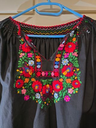 Blusa artesanal de la marca Muzungu Sisters con un vibrante bordado floral. Precio nuevo 240 Euros - Diseño de cuello en V con detalles de smock. - Mangas cortas con borde de encaje rojo. - Elaborado bordado multicolor en el pecho. - Acabado con encaje rojo en los puños.
