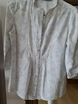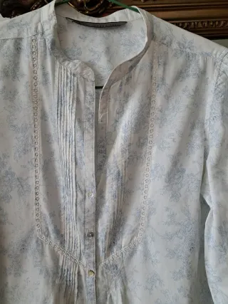 Blusa blanca con un delicado estampado floral en tonos azules. Presenta un diseño con cuello mao y detalles de plisados y puntilla en la parte delantera. - Manga larga. - Cierre de botones. - Estampado floral.