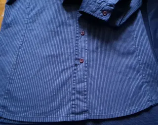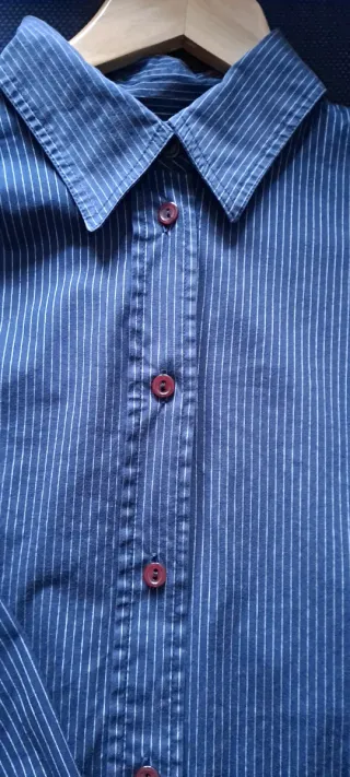 Blusa de color marino de manga larga con cuello camisero y botones. - Diseño de rayas verticales finas. - Botones de color burdeos. - Cuello clásico. Tiene por dentro una tira para enganchar el botón que tiene en la muñeca y llevarla remangada. Talla L.Entallada. Material: 91% de algodón, 4%de elastan y 5% de poliestireno.Nunca utilizada.