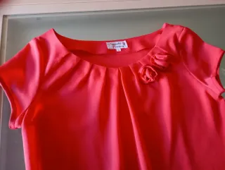 Elegante blusa de color rojo con un diseño delicado. - Detalle de flores aplicadas en el escote. - Mangas cortas. - Cuello redondo con fruncido.
