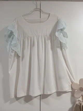 Blusa con detalles de encaje en las mangas y en la parte superior del pecho. El corte es holgado y favorecedor. - Mangas con volantes de encaje. - Adorno de encaje en el escote. - Tallas disponibles: 50, 52.