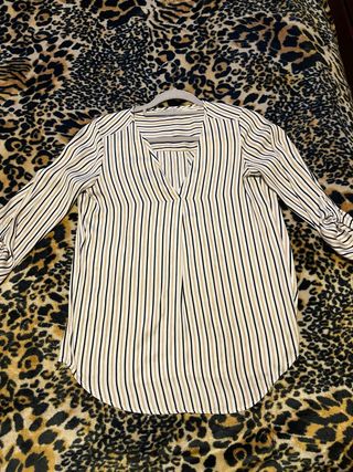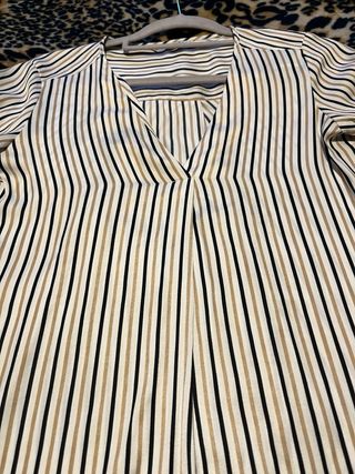 Blusa de tela muy suave con un diseño de rayas verticales. - Diseño de rayas en beige y negro. - Cuello en V. - Mangas largas.