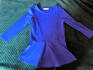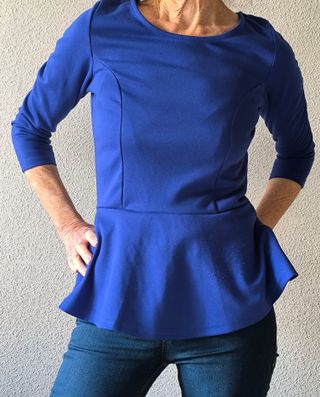 Blusa con corte peplum en color azul. Se han formado unas bolitas en una zona. - Mangas tres cuartos. - Diseño entallado con vuelo en la parte inferior.