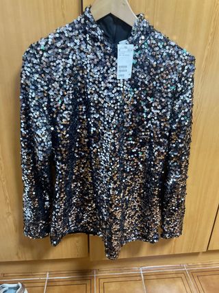 Elegante blusa con un diseño brillante de lentejuelas. - Cubierta completa de lentejuelas. - Cuello alto.