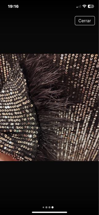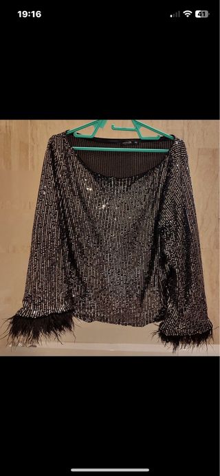 Preciosa blusa con lentejuelas y detalles de plumas. - Diseño con escote cuadrado. - Mangas largas. - Adornos de plumas en los puños.