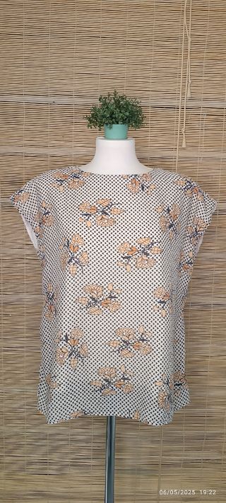 Preciosa blusa de gasa con estampado floral. Es de color beige y naranja, con un diseño delicado y femenino. - Tiene un corte favorecedor. - La tela es ligera y fresca, ideal para la primavera-verano. - Presenta un detalle de vuelo en la parte inferior. Tiene forro por debajo.