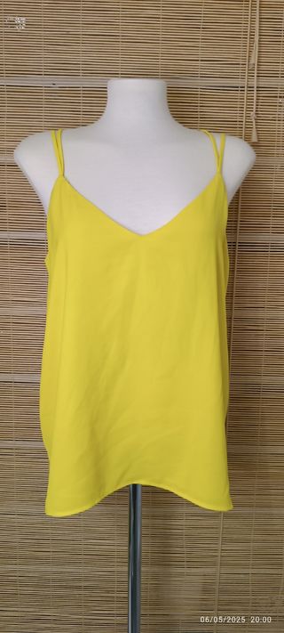 Preciosa blusa sin mangas de Zara en color amarillo. Es una prenda elegante y cómoda, ideal para cualquier ocasión. - Talla M. - Diseño con nudo frontal. - Tejido ligero y fluido.