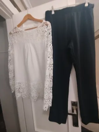 Conjunto de blusa y pantalón. - Blusa con detalles de encaje en mangas y cuello. - Pantalón de corte recto.