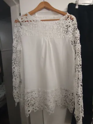 Blusa de algodón en blanca con encaje en las mangas, tejido con relieve Talla M 100% algodón Medidas sisa 48 cm