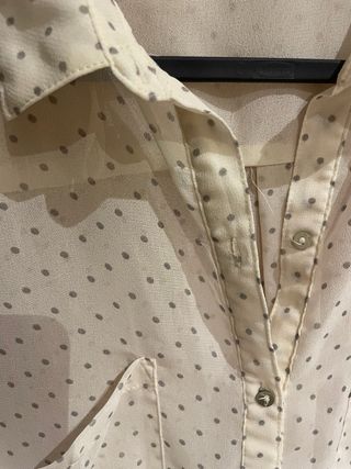 Blusa larga de Zara en color beige con un delicado estampado de puntos. Su tejido transparente le da un toque elegante. - Diseño con cuello camisero. - Dos bolsillos delanteros. - Cierre de botones. - Bajo largo y curvo. - Talla grande. - Muy cómoda de llevar y la tela no se arruga.