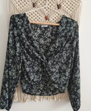 Blusa con un diseño cruzado y nudo en la parte delantera. El estampado floral le da un toque especial. - Manga larga. - Cuello en V. - Tejido ligero y fluido. Es talla XS, pero amplia Poco uso, está perfecta