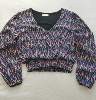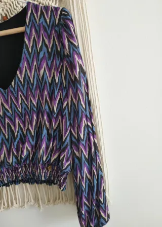 Blusa corta con estampado geométrico tendencia en tonos morados y azules. Presenta un escote en pico y mangas largas abullonadas. - Diseño crop. - Cintura elástica fruncida. - Tejido ligero y fluido. Es única, pero realmente va bien para XS y S
