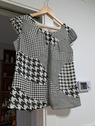 Blusa con un llamativo estampado. - Diseño de pata de gallo en diferentes tamaños. - Mangas cortas. - Cuello redondo.