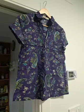 Blusa de mujer con un bonito estampado. En buen estado, casi sin uso. - Cintura elástica fruncida. - Manga corta. - Cuello redondo con abertura.