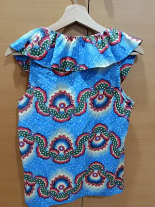 Blusa de la marca Minueto con bonito estampado para el verano. Lleva un volante por el cuello.