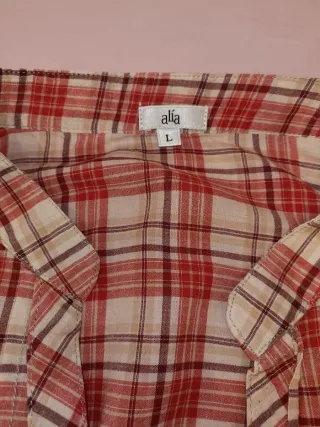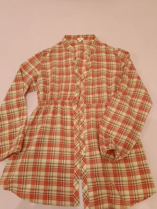 Blusa de cuadros con un diseño cómodo y favorecedor. - Estampado de cuadros en tonos beige y rojo. - Cuello mao. - Cintura elástica para un mejor ajuste. - Manga larga - Cierre delantero con botones - Textura fina