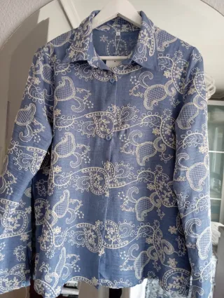Blusa de manga larga con un bonito estampado de bordados en color crema sobre fondo azul. El diseño es elegante y detallado, perfecto para añadir un toque especial a tu atuendo. - Talla XL. - Bordados en contraste.