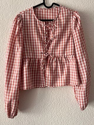 Blusa con estampado de cuadros. - Diseño con lazada frontal. - Mangas largas abullonadas. - Corte peplum.