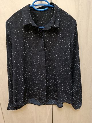 Blusa azul marino con topos blancos Zara Basic talla S, manga larga con botón, y lleva tela doble haciendo un bonito volante. Queda muy bonita.Mide 37x55