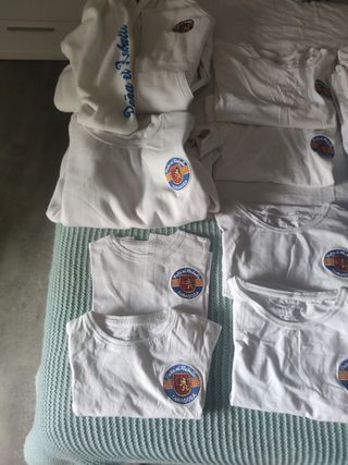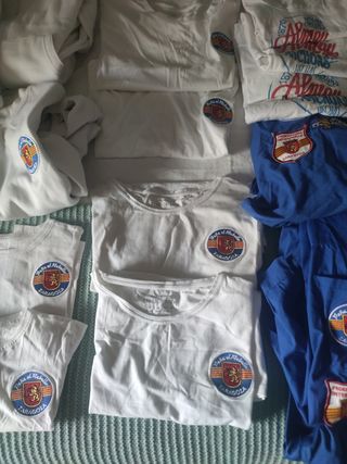 ropa de hombre, mujer y niño , algunas sin estrenar, talla 6-7, 2 camisetas y bluson talla 10, 2camiseta mujer talla m, sudadera S y bluson talla P, 2 camisetas hombre talla L, pañuelos y regalo camisetas aniversario