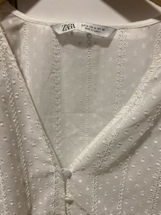Blusa de Zara con un delicado tejido plumeti. - Diseño con escote en V. - Cierre de botones. - Mangas largas con detalle. - Bajo con acabado festoneado. - El primer botón está ligeramente estropeado (ver foto).