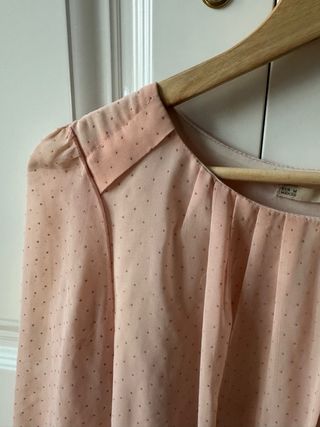 Blusa romántica de Zara con tejido plumeti y detalles de volantes. Color algo rosado. Da mas talla. - Cuello mao. - Cierre de botones. - Mangas largas abullonadas. - Volantes escalonados en el pecho. - Tejido ligero y vaporoso.