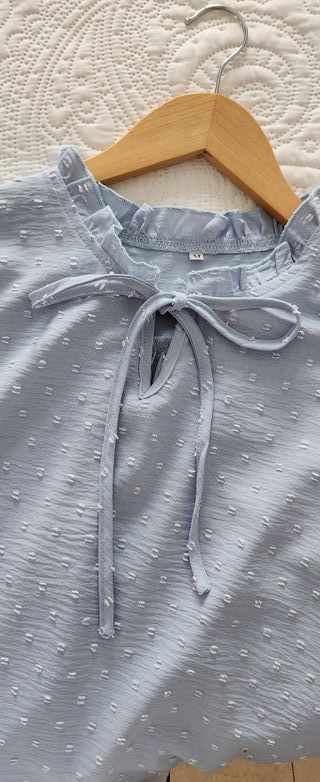 Blusa con tejido plumeti. Completamente nueva ,,talla única se adapta entre una 36/40 ,,un botón de atrás tiene el esmalte algo levantado y la blusa está completamente nueva ,,no necesita plancha vy queda muy elegante con un estilo romántico