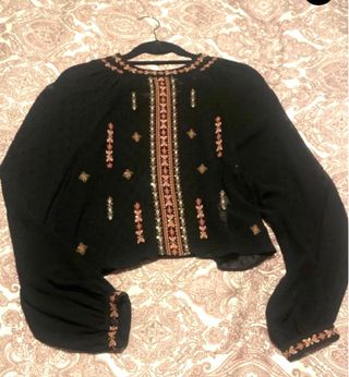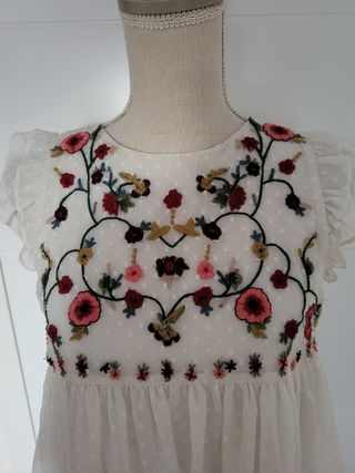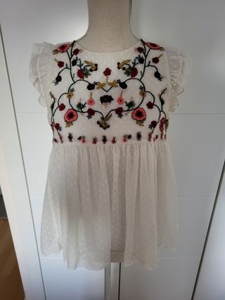 Blusa de Zara con tejido plumetí y un bonito bordado floral en la parte delantera. Las mangas son largas y transparentes. - Diseño con bordado multicolor. - Tejido ligero y con textura plumetí. - Mangas largas y transparentes. - Con forro. - Está nueva puesta muy poco. - Cierre espalda con botones. -Volante en mangas. Medidas:Hombro : 39 cm. Largo : 60 cm. Cae suelta .
