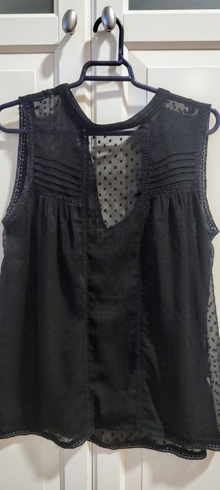 Blusa de gasa de plumeti negra. Talla S, marca Zara Entrega en mano de lunes a viernes entre 9:15 y 16:45 en barrio Recoletos-Argensola. Sino en Aranjuez o envío
