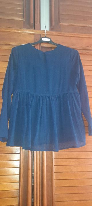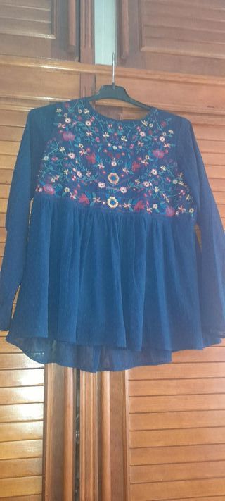 Blusa azul marino de plumeti con bordado de flores en parte delantera. La talla es S. De la marca TEX. Está como nueva.