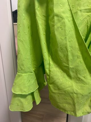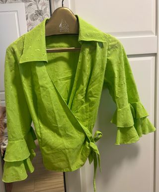 Blusa de estilo flamenco o rociero en Batista perforada verde pistacho. - Cuello camisero. - Mangas al codo con pequeño volante. - Cierre de botones. Posibilidad de meter o sacar a las costuras