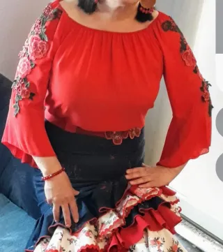 Blusa rociera,preciosa de color Rojo, lleva también camiseta interior por su transparencia, en perfecto estado,nueva. T- XXL