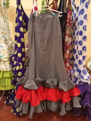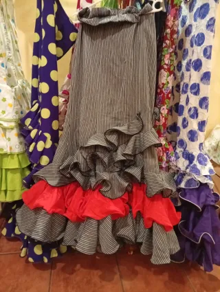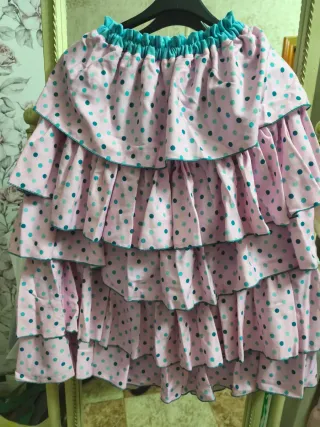 Diferentes conjuntos de blusas y faldas rocieras, colores vivos y tallas diferentes, puedes obtenerlos en conjunto o prendas individuales, todas tienen un precio entre 5-10€ si tienen alguna duda pregunten sin compromiso. -Falda roja con detalles amarillos y negros XL -blusa negra XL -blusa blanca (larga) XL - vestido verde con lunares negros XL -Blusa blanca (corta) XL -Falda gris con lunares y franja blanca XXL -Falda celeste con detalles azul marino XL -Blusa naranja XL -Falda azul con detalles naranjas XL
