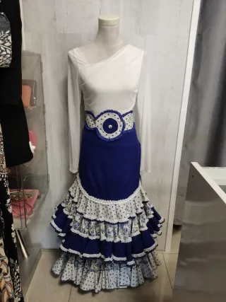 Conjunto de falda rociera y blusa. - Falda azul con lunares blancos. - Blusa blanca con volantes y detalles. - Como nuevo.