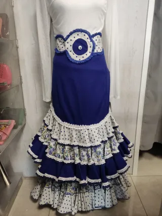Falda rociera con un diseño vibrante y volantes. - Cuerpo superior blanco con manga larga. - Cinturón decorativo con detalles. - Falda azul con múltiples volantes. - Volantes inferiores con estampado de lunares y flores. Talla equivale a 46/48 , mirar medidas cintura 50 cm, cadera 53, se le puede sacar algo, el precio de la falda es así porque tiene un pequeño arañazo en la cintura que apenas se aprecia, por lo demás está impecable.( Se vende sólo la falda con el cinturón, la blusa no está incluida)