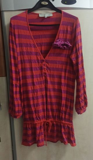 Ropa de mujer Vestido corto o blusa larga color negro con estampado en naranja (es un naranja quemado, casi rojo) Tiene talla 2 (medidas y composición en fotos) Buen estado. Camiseta lisa color beige. Tiene talla 2xl (medidas en fotos) Marca Phuket. Buen estado Pinkies o pikis grises.