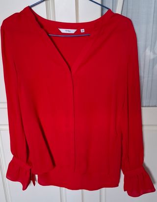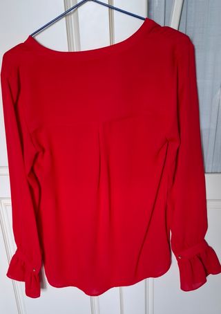 Preciosa blusa roja de la marca Bimani (Biombo 13). Es de manga larga con puños abotonados y tiene un bonito escote en V. - Elegante y versátil. - Perfecta para cualquier ocasión. - Talla M. Aunque no tiene etiqueta, se la corte porque me molestaba.