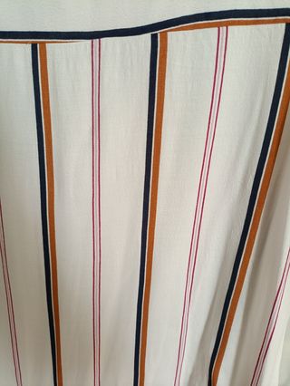 Blusa blanca de rayas verticales en color camel, marino y rojo. Muy poco uso, como nueva. Talla S.