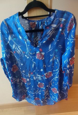Blusa de mujer, con un estampado floral en tonos rojos sobre fondo azul. Es de tela muy ligera apropiada para esta primavera-verano y de corte amplio. - Mirar fotos, pongo medidas. - Manga tres cuartos. - Cuello en pico. Tiene la parte trasera más larga. Nunca se ha usado pero corté las etiquetas