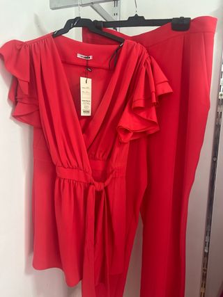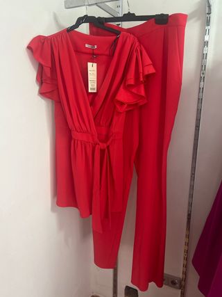 Elegante traje de chaqueta en color rojo. - Chaqueta con solapas y cierre de botones. - Detalle de pespunte decorativo en las solapas. - Pantalón a juego. 25 € - Blusa flores transparente con bolante en escote y espalda al aire a parte 12€.