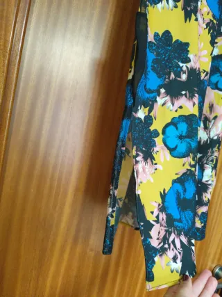 Blusa de manga larga con un bonito estampado floral sobre fondo morado. Es una prenda sin estrenar y aún conserva su etiqueta. - Diseño con cuello redondo. - Mangas abullonadas en los hombros. - Tejido ligero con textura.