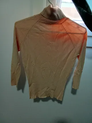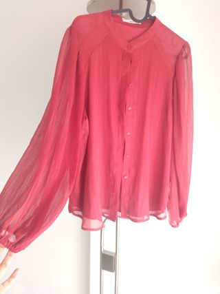 Blusa de Mango en talla L, en tono granate claro / rojo vino suave, muy elegante y favorecedor. En muy buen estado. Diseño con cuello mao y botonadura frontal con botones ocultos, lo que le da un acabado más limpio y sofisticado. El cuerpo va forrado, por lo que no transparenta, mientras que las mangas largas son semitransparentes, confeccionadas en un tejido ligero y fluido. El tejido presenta finas rayitas verticales con un sutil brillo, que aportan un toque especial sin resultar excesivo. Las mangas tienen una ligera caída abullonada que aporta movimiento y un aire delicado. Medidas: sisa: 51cm, largo: 61.5cm